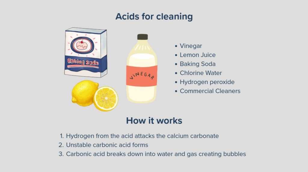 Minerals can be broken down with acids, and the minerals from hard water stains have specific acids that can be used. The most effective cleaners for hard water stains are acidic solutions such as white vinegar or lemon juice, which help clean hard water stains by dissolving mineral deposits. The hydrogen attacks the calcium and creates an unstable carbonic acid which quickly breaks down into water and gas, creating bubbles (fizzing). For stubborn stains, a strong commercial product may be necessary to clean hard water stains, especially when regular acidic solutions are not enough. To effectively remove water stains, it is often necessary to scrub the affected area with a brush or non-abrasive pad after applying the cleaning solution.
