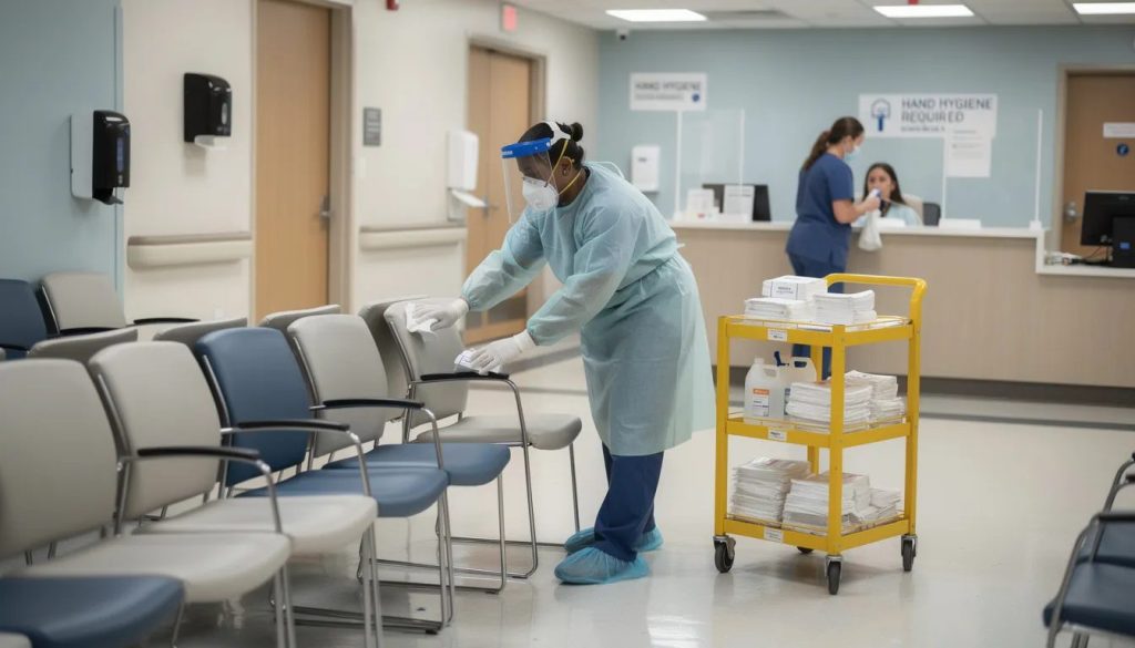 Medical cleaning in healthcare environments involves systematic removal of pathogens, organic matter, and contaminants from patient care areas, medical equipment surfaces, and high touch surface disinfection zones. Unlike routine cleaning, medical facility cleaning follows strict infection control protocols designed to prevent healthcare associated infections and ensure compliance with federal and state healthcare standards. Medical cleaning in healthcare facilities involves specialized cleaning protocols, the use of medical-grade disinfectants, and strict regulatory adherence to maintain a safe and hygienic environment.